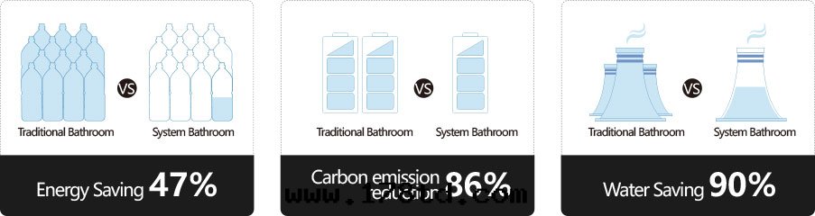According to relevant statistics, the system bathroom save energy 47% more than traditional bathroom; emitting carbon dioxide 14% less; water saving 90 % more.