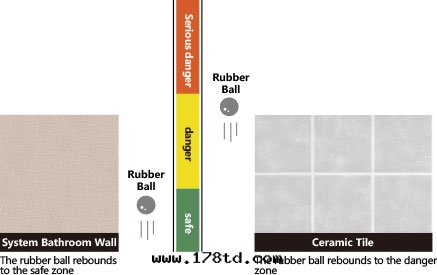 The same two rubber balls, roll along the track from the same height, and respectively hit the wallboards of system bathroom and tiles of traditional bathroom ; the longer the distance it rebounds mean the stronger bounce, and the higher degree of harm to the human body.