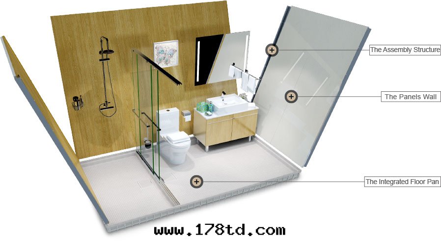 System Bathroom is the overall framework combined of waterproof floor pan, ceiling and wall panels, coupled with a variety of independent sanitary ware unit, having three functions of shower, washing, and toileting or any combination between these functions, to achieve the best overall effect in a minimum of space.