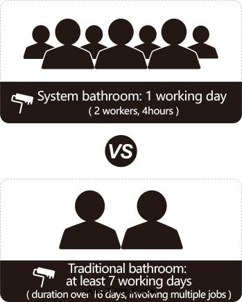 The construction duration of traditional bathroom is up to two weeks, covering bricklayer, plumbers, and a plurality of types of workers, comparatively speaking, system bathroom takes only two industrial workers, 4 hours to install, greatly improving efficiency, reducing construction costs.