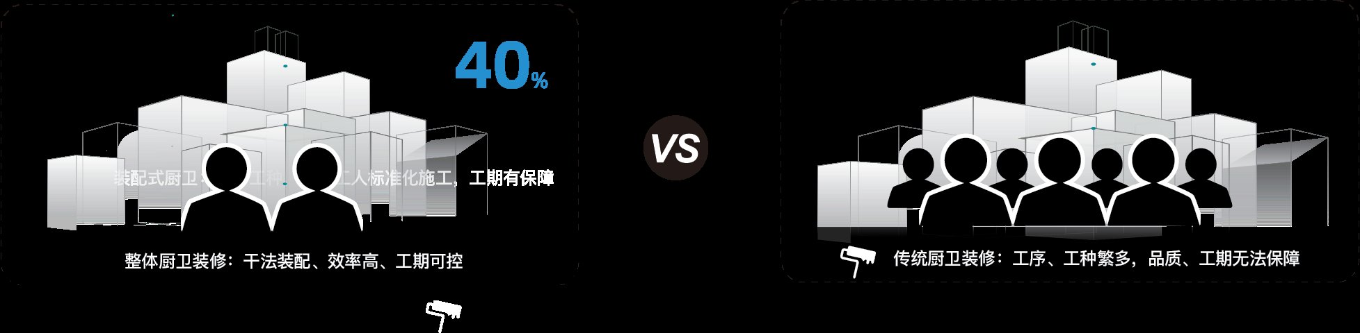 入(rù)住时(shí)間(jiān)難以保證 |厨衛虽小,但工序複雜,涉及防水(shuǐ)、貼磚(zhuān)、水(shuǐ)電(diàn)管道(dào)鋪設、配件安(ān)装等工序,傳統厨衛工期(qī)至(zhì)少(shǎo)2周,相當一(yī)部分(fēn)需要(yào)厨衛改造的(de)業主(zhǔ),迫切(qiè)需求短(duǎn)时(shí)間(jiān)內(nèi)即可(kě)安(ān)装入(rù)住。