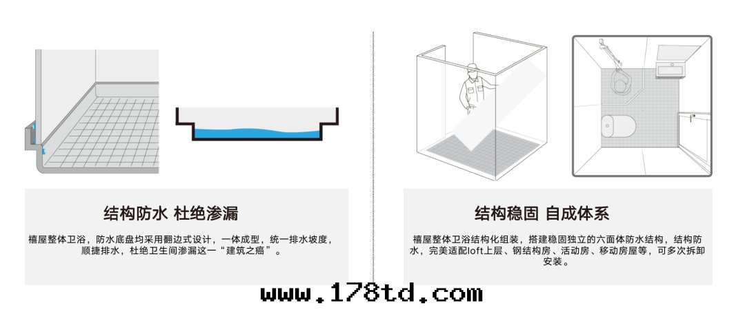 例:禧屋(wū)整體(tǐ)衛浴,采用(yòng)新(xīn)型高(gāo)科技材料整體(tǐ)制作(zuò)出(chū)衛生(shēng)間(jiān)地(dì)面(miàn)、牆(qiáng)面(miàn)、天(tiān)花(huā),现场(chǎng)干(gàn)法(fǎ)施工,4小时(shí)即可(kě)完成(chéng)拼装,並(bìng)集成(chéng)了(le)洗漱、如(rú)廁、沐浴等配套(tào)設施的(de)衛浴解(jiě)決方(fāng)案(àn)。