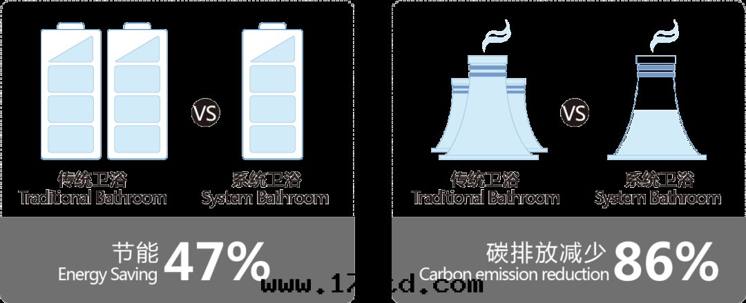 根(gēn)據(jù)相關(guān)統計(jì)數據(jù)顯示,系(xì)統衛浴能(néng)耗比傳統浴室(shì)节(jié)約近(jìn)47%;二(èr)氧化(huà)碳排量(liàng)降低(dī)86%;节(jié)水(shuǐ)90%以上(shàng)。