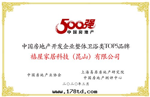 2020年(nián)3月(yuè)18日(rì),中(zhōng)國(guó)房(fáng)地(dì)産500强測评成(chéng)果(guǒ)通过(guò)線(xiàn)上(shàng)發(fà)布的(de)方(fāng)式圆(yuán)滿落(là)幕。禧屋(wū)以10%的(de)品牌(pái)率問(wèn)鼎!蟬聯“2019中(zhōng)國(guó)房(fáng)地(dì)産開(kāi)發(fà)商企業500强整體(tǐ)衛浴類(lèi)品牌(pái)TOP5”榜首。