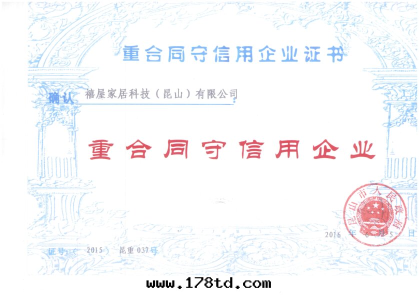 近(jìn)期(qī),为進(jìn)一(yī)步增强企業信(xìn)用(yòng)意(yì)識,創造良好(hǎo)的(de)市(shì)场(chǎng)信(xìn)用(yòng)环(huán)境,激勵守信(xìn)、懲戒失信(xìn),全(quán)面(miàn)打(dǎ)造“诚信(xìn)昆山(shān)” ,江蘇省(shěng)昆山(shān)市(shì)人(rén)民政(zhèng)府根(gēn)據(jù)《江蘇省(shěng)重(zhòng)合同(tóng)守信(xìn)用(yòng)企業認定管理辦(bàn)法(fǎ)》评定重(zhòng)合同(tóng)守信(xìn)用(yòng)企業,通过(guò)对(duì)禧屋(wū)資本(běn)运營、産品質(zhì)量(liàng)、社会行为、經(jīng)營者(zhě)素質(zhì)及企業管理、發(fà)展(zhǎn)趨勢等全(quán)方(fāng)面(miàn)的(de)審核,禧屋(wū)被(bèi)授予2015年(nián)度(dù)昆山(shān)市(shì)“重(zhòng)合同(tóng)守信(xìn)用(yòng)企業”榮譽稱号(hào)。